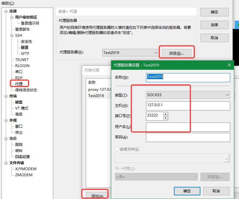 记得选择“代理”:添加一个代理:类型:SOCKS5,主机:127.0.0.1(其实就是能连接到上面隧道PC上即可),端口:22222,用户名、密码空即可。