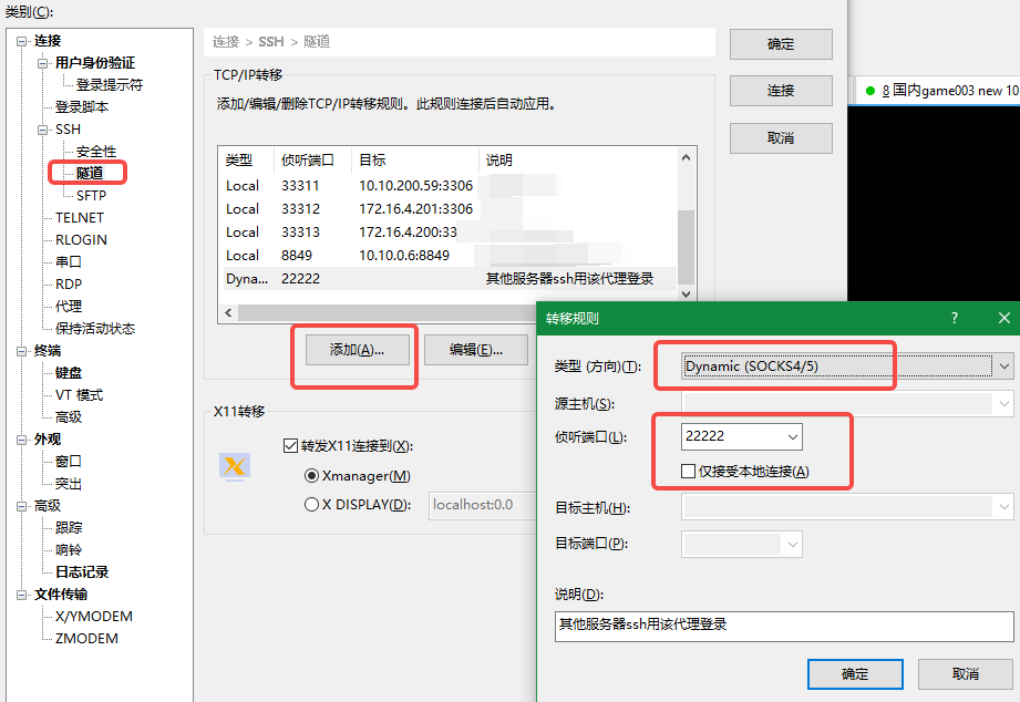 记得添加一个“隧道”:类型:Dynamic(SOCKS4/5),侦听端口:22222(确保没被PC上其他程序占用的端口)。